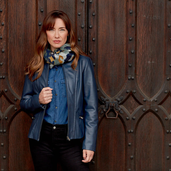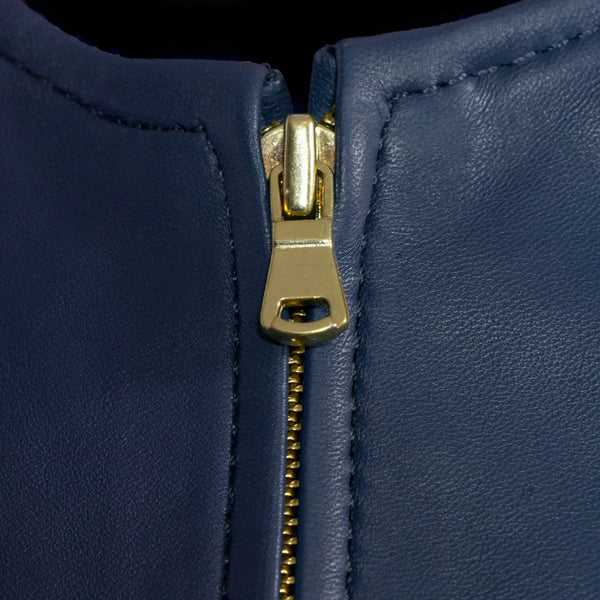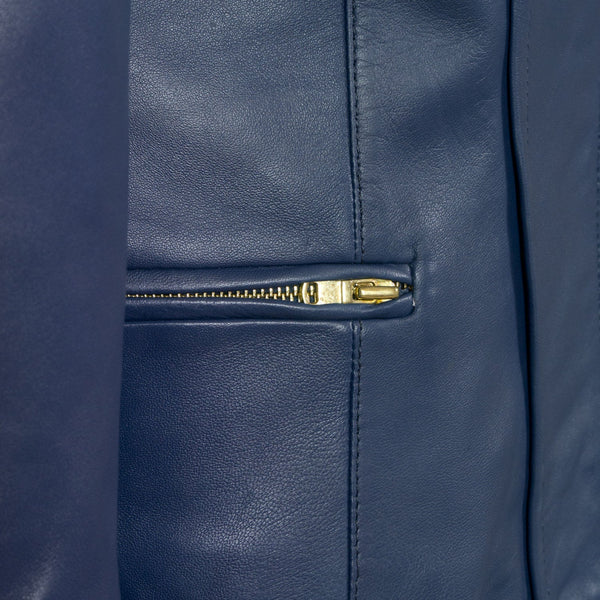 Investing in a leather jacket means investing in timeless style and durability. This distinctive blue collarless jacket offers a modern edge while maintaining versatility, making it a standout piece for any wardrobe.